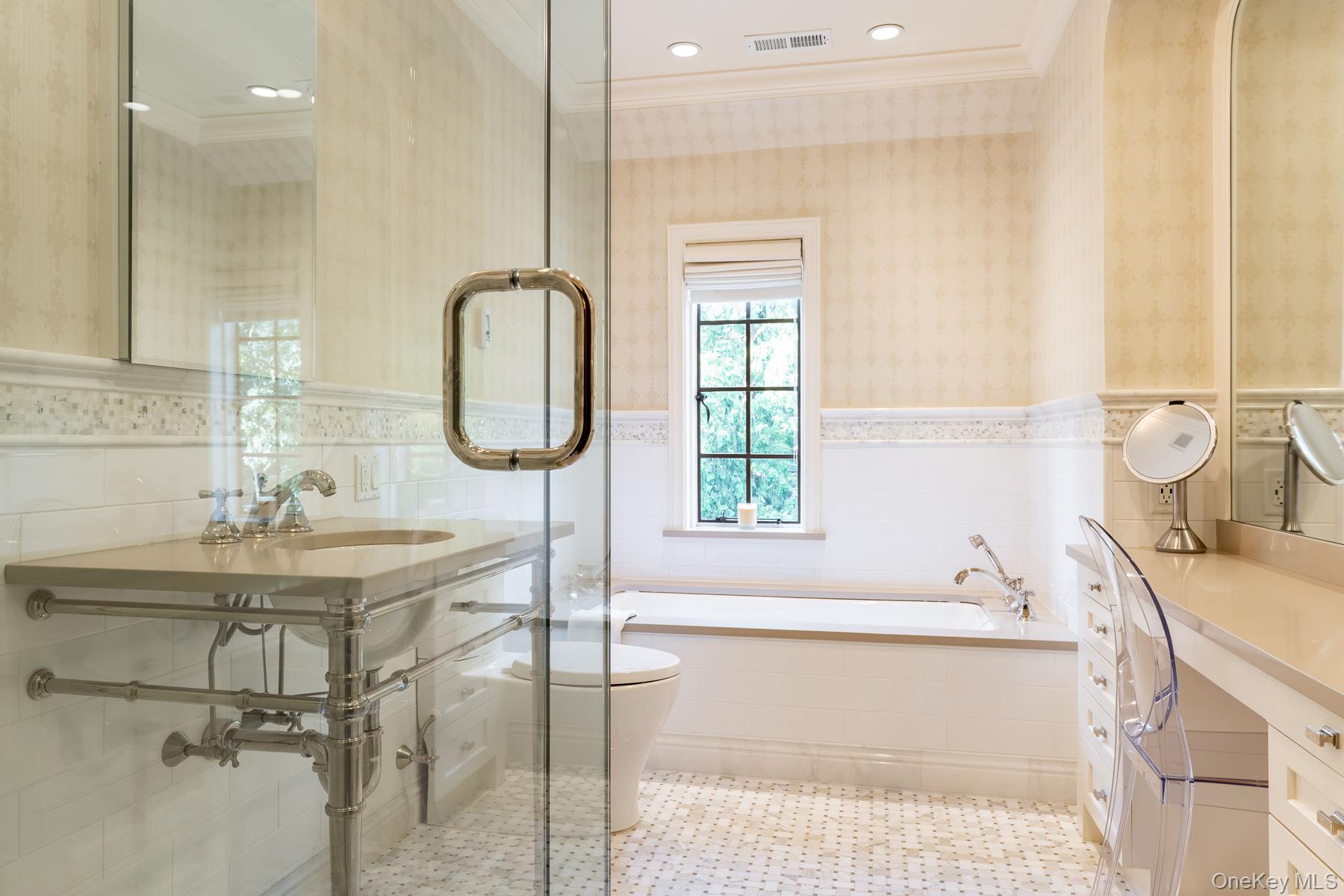 The lower level offers spaces tailored for recreation and wellness, including a theater/playroom, wine cellar, expansive gym/Pilates studio with a full bathroom, and a laundry area. A mudroom connects the garage with the back stair for convenience. The second-floor primary wing is a luxurious retreat featuring a sitting room, fireplace, renovated ensuite bathroom, and custom-built closets. Four additional family bedrooms are complemented by three renovated full bathrooms, while flexible rooms serve as a yoga studio, homework space, or office. A private deck with a hot tub overlooking the gardens adds to the home's sense of relaxation.