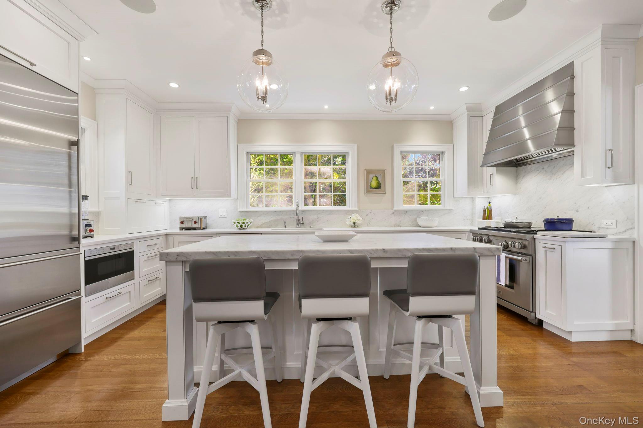 At the heart of the home is a beautifully redesigned eat-in kitchen by Deane Kitchens, featuring top-of-the-line Wolf and Sub-zero appliances, a custom banquet, spacious dining area, large center island, pantry, and mudroom. Designed with both everyday living and entertaining in mind, the kitchen opens to a private, level backyard with two flagstone patios, a gas grill hookup, and mature plantings--an ideal setting for gatherings or quiet outdoor enjoyment.