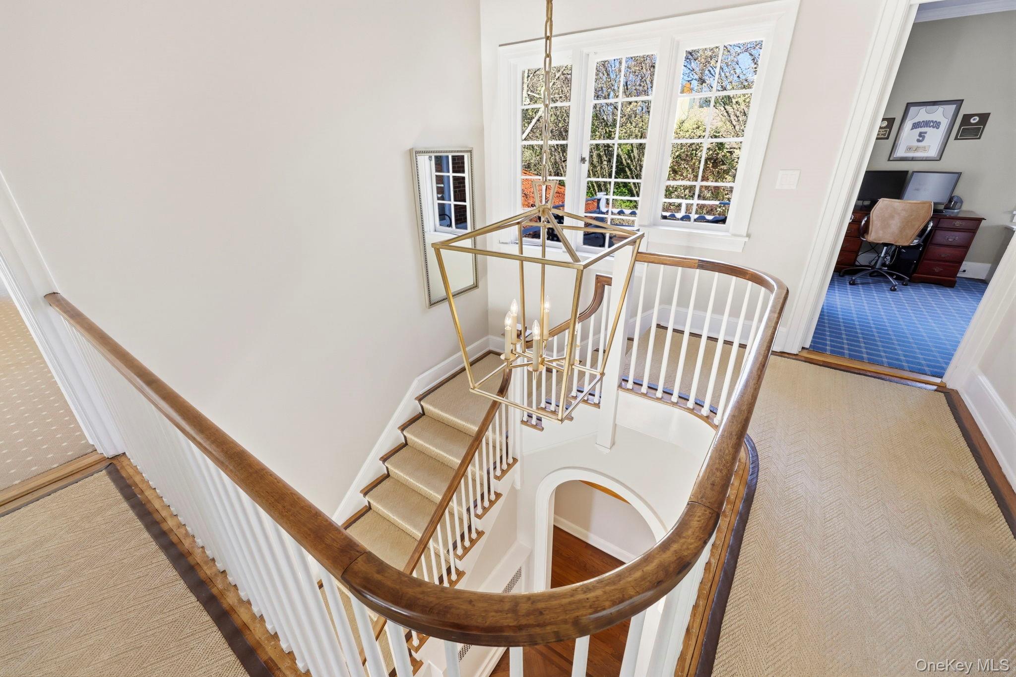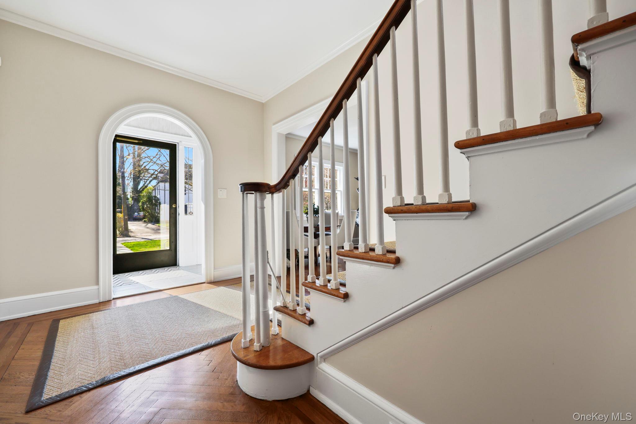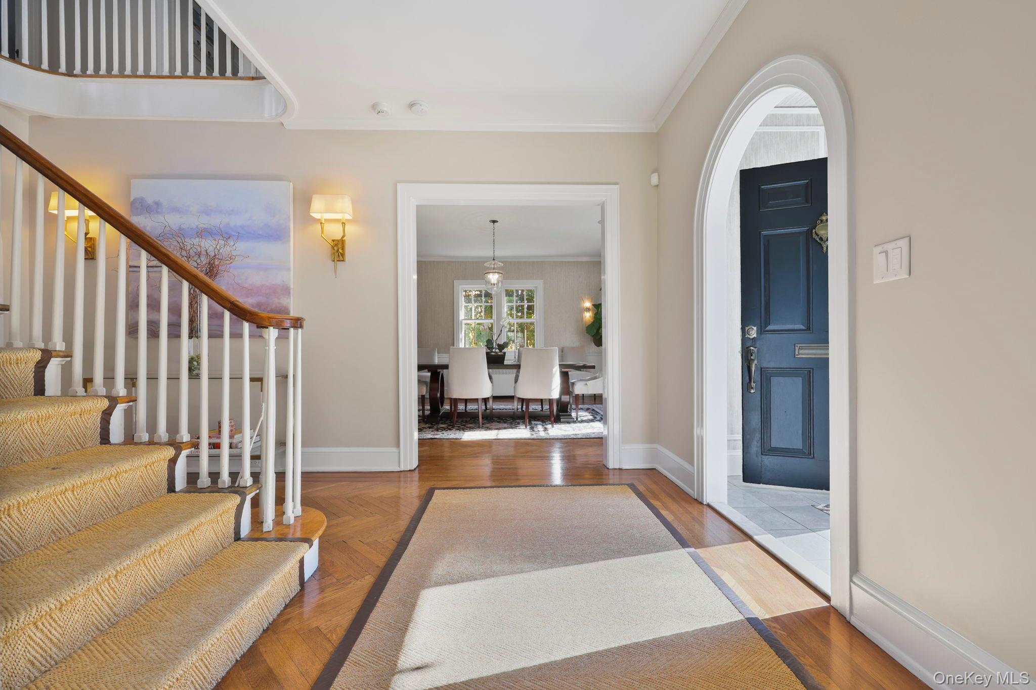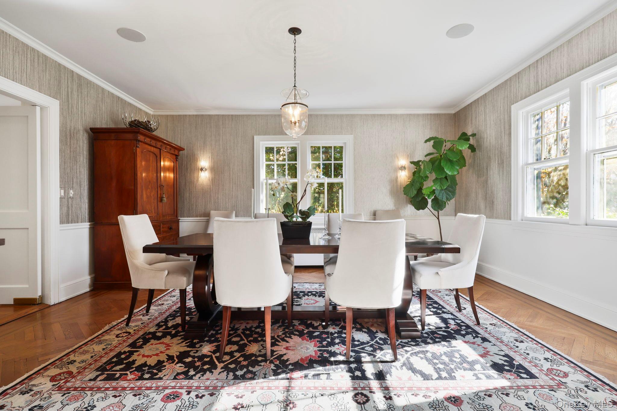 A gracious entryway welcomes you inside, highlighted by a stunning curved staircase and exquisite herringbone wood floors. Generously proportioned rooms, soaring ceilings, and an abundance of natural light create an inviting and airy atmosphere throughout.